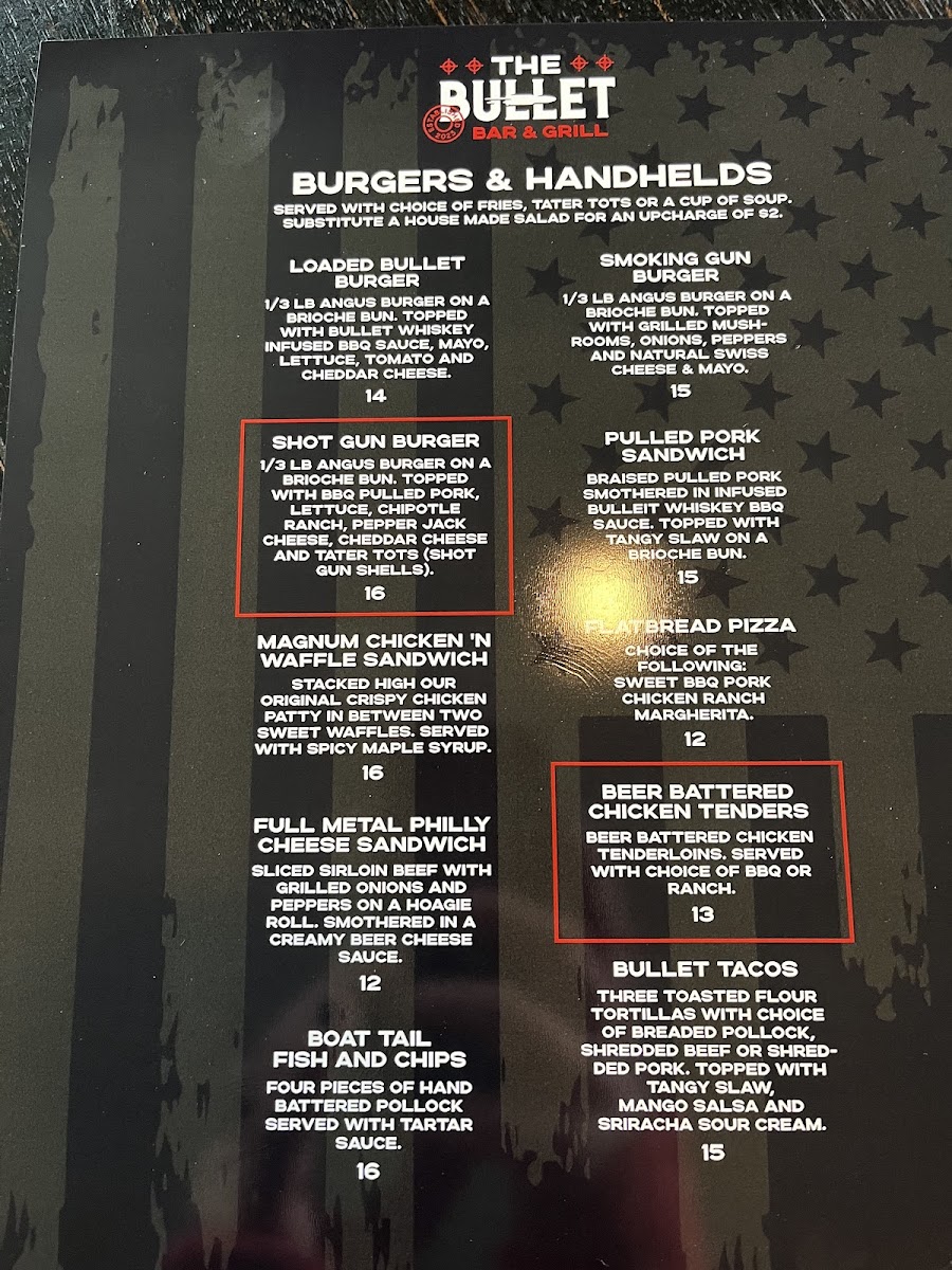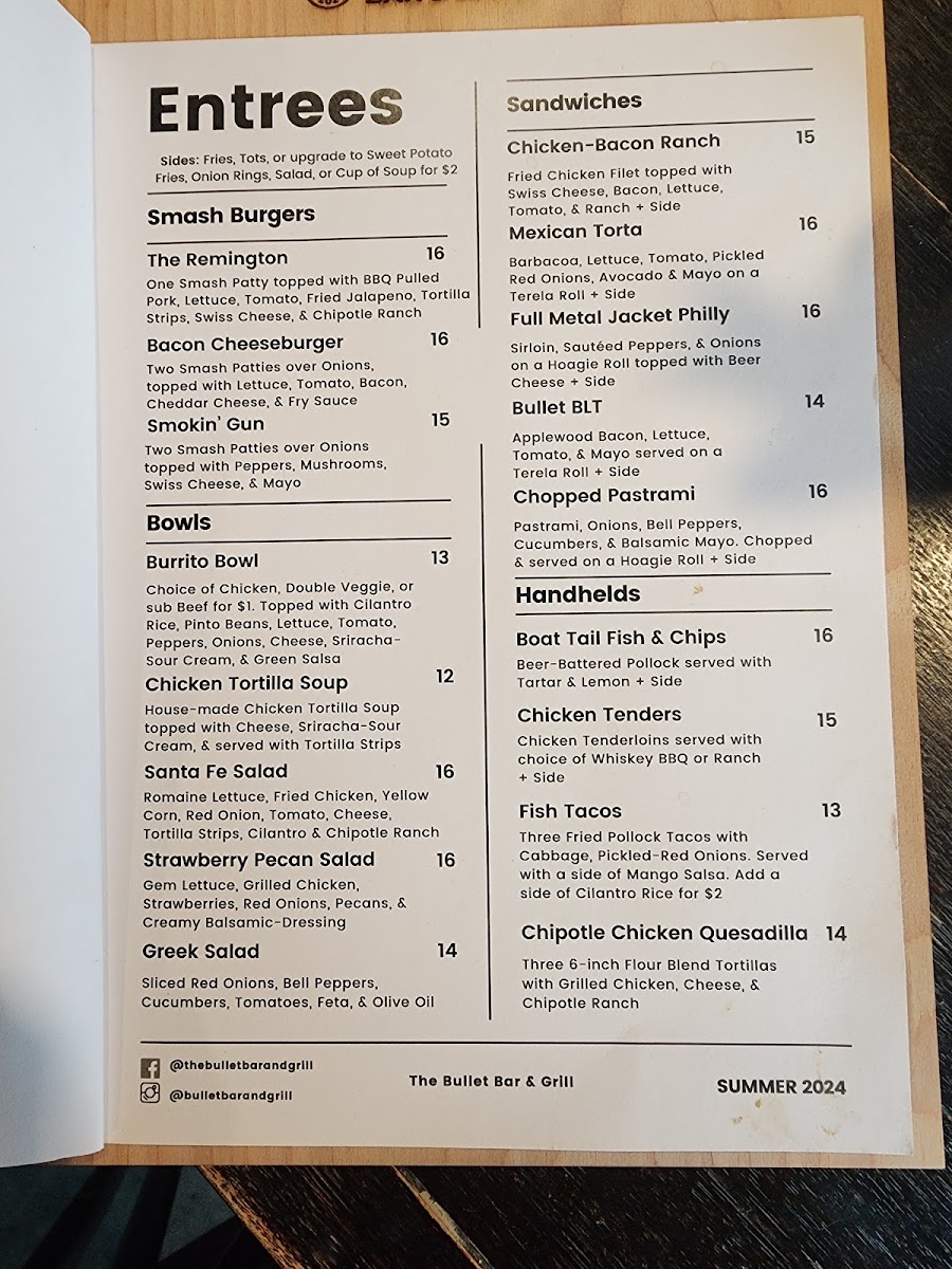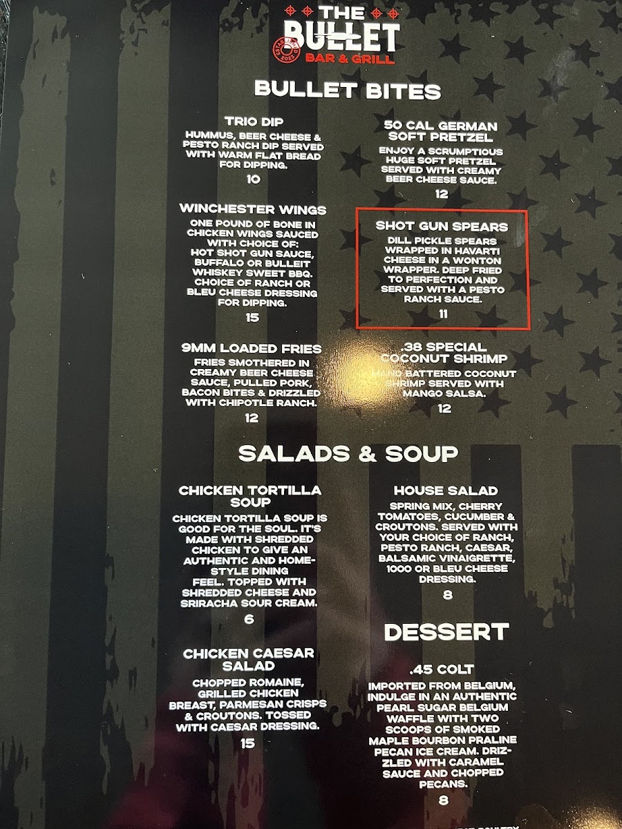 Introducing the menu at The Bullet Bar & Grill is a culinary adventure that captivates your senses. Nestled in Post Falls, ID, this lively eatery offers a diverse selection that will excite both traditional and adventurous palates. Start with the Cobb Salad for a refreshing touch, priced at just $16.00, or dive into the Winchester Wings, a must-try at $16.00, perfect for sharing. The 9 Mm Loaded Fries and 3030 Sliders promise hearty bites that embody the essence of comfort food.